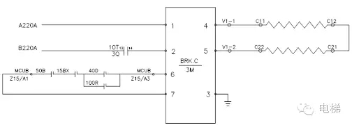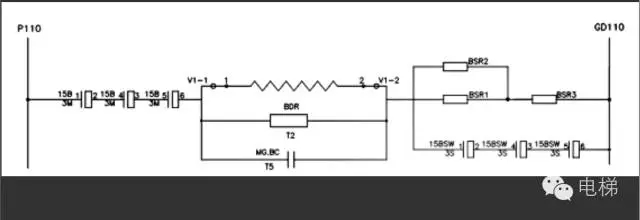 2.當(dāng)抱閘控制方式為接觸器驅(qū)動時,使用日立HSGL型主機或廣日主機,使用抱閘接觸器對抱閘供電控制,控制柜內(nèi)有BDR及BSR制動電阻。其抱閘控制回路如下圖所示: