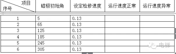 ⑷ 按下表的方式以每次對F7.09(磁極初始角)加60的方式進(jìn)行記錄,最終保證檢修時速度等于設(shè)置的檢修速度;