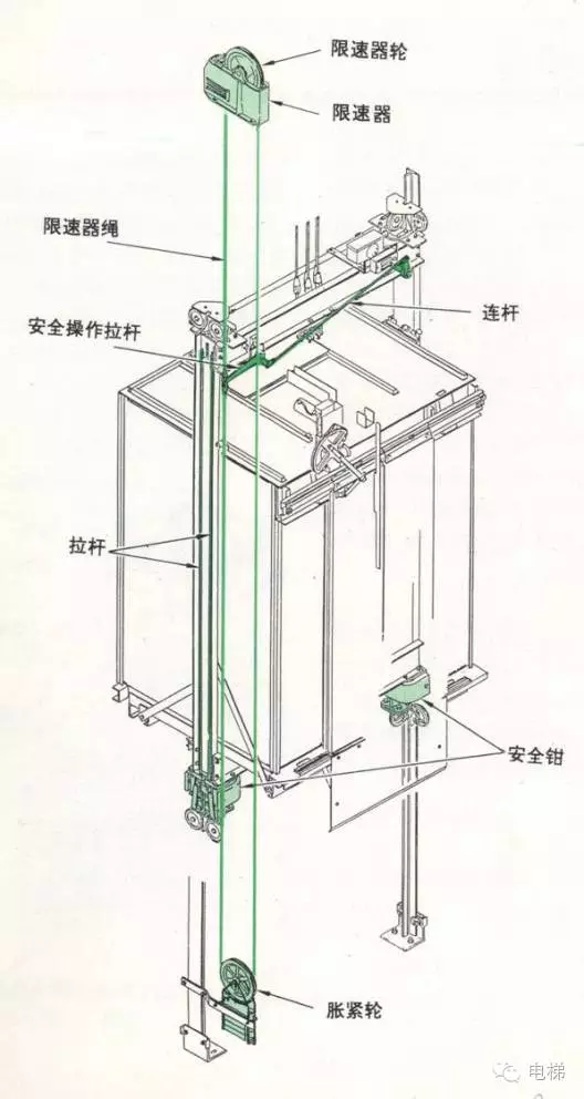 限速器的鋼絲繩圍繞著繩輪和底坑中的脹繩輪形成一個(gè)閉環(huán),其繩頭部與轎廂緊固在一起,并通過(guò)機(jī)械連桿與安全鉗連起來(lái)。如果轎廂超速,限速器立即動(dòng)作,觸發(fā)夾繩裝置夾緊鋼絲繩。當(dāng)轎廂下降時(shí),鋼絲繩拉動(dòng)安全鉗運(yùn)作使安全鉗對(duì)導(dǎo)軌產(chǎn)生摩擦力,把轎廂迅速制動(dòng)在導(dǎo)軌上,停止運(yùn)動(dòng)。(見(jiàn)下圖)